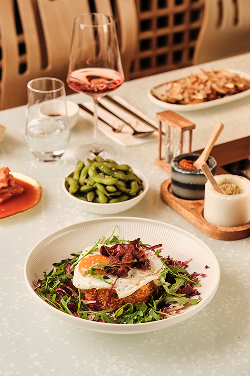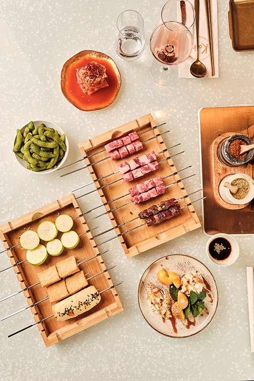 Als Vorspeise servieren wir Ihnen einen Hot Pot - Australisches F1 Wagyu roh aufgeschnitten mit Rinder Kraftbrühe und Gochujang (Koreanische Chilisauce) angegossen. Zum Hauptgang bieten wir Ihnen einen gegrillter Angus Rinderfiletspieß 200g mit Kimchi Beurre Blance, koreanischem eingelegtem Gemüse und weißem Reis mit geröstetem Sesam und Nori. Als krönenden Abschluss: Zweierlei Mochi, gefüllt mit Mango Eis und Matcha Eis mit Yuzo Gel.